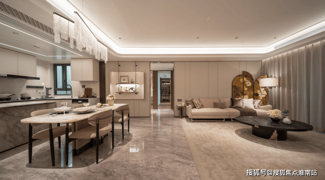 客餐厅方面,电视布景墙采用卡慕白石材+皮革,均为交付尺度;地面采用简一(或划一品牌)的900*1800仿石砖,密拼施工,几乎看不到有任何裂缝——相信有拆修经验的小伙伴必然晓得,这种大砖的价钱和如许的密缝工艺成本有多高!
